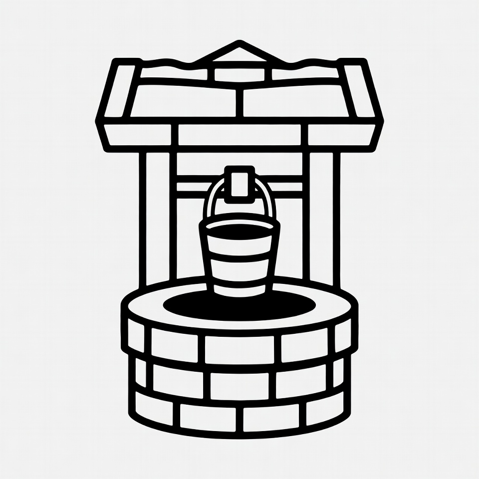 A simple black line illustration depicts a traditional stone well with a peaked wooden roof. A bucket hangs from a rope over the dark circular well opening. The design features clean outlines on a white background.
