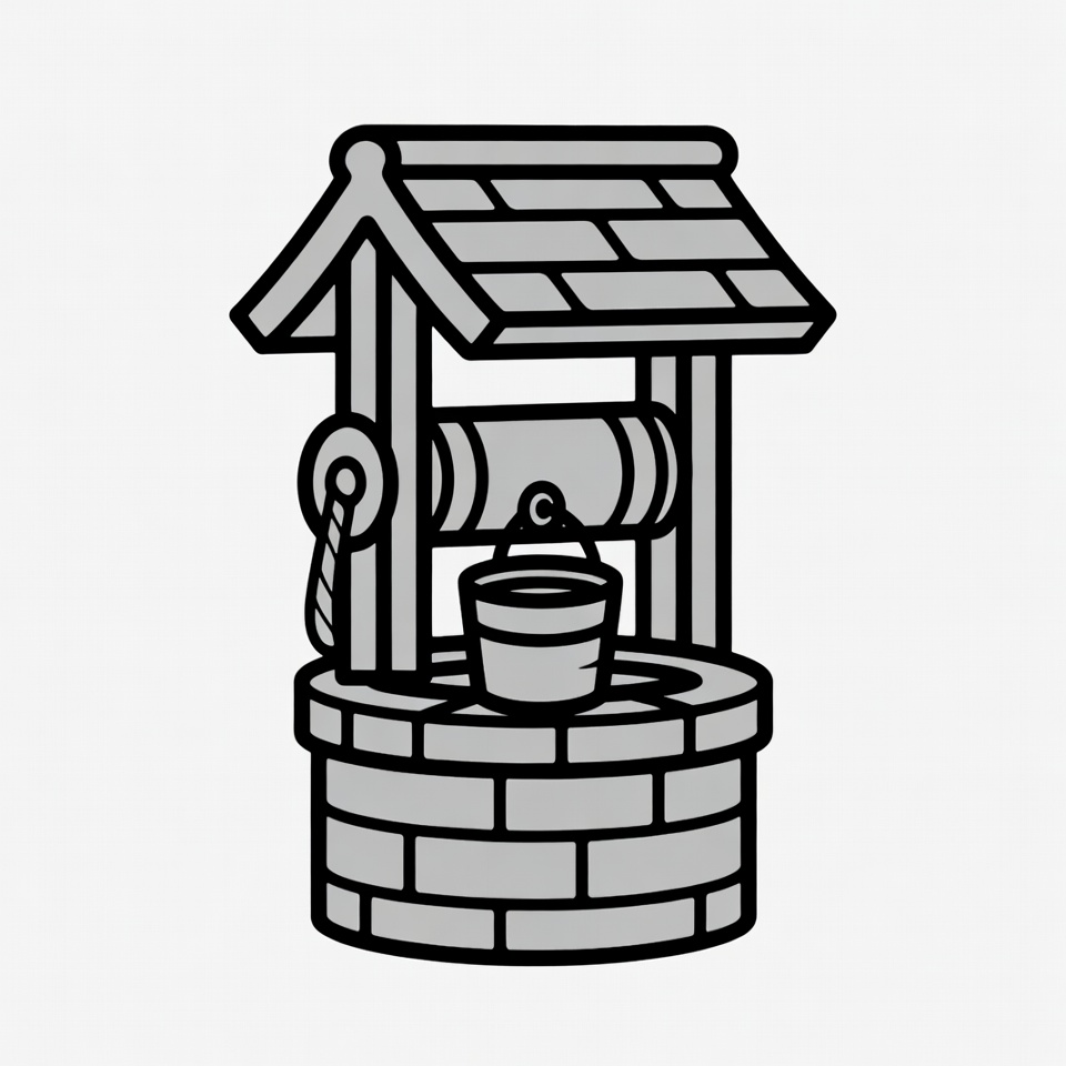 bucket, cartoon well, clipart, drawing, gabled roof, gray well, illustration, isolated background, line drawing, rope, stone well, traditional well, water well, wooden frame, well