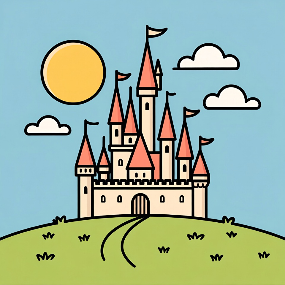 A colorful cartoon illustration depicts a tall castle with red towers and flags on a green grassy hill. A bright yellow sun shines in the blue sky above fluffy white clouds. A path leads to the castle's entrance.
