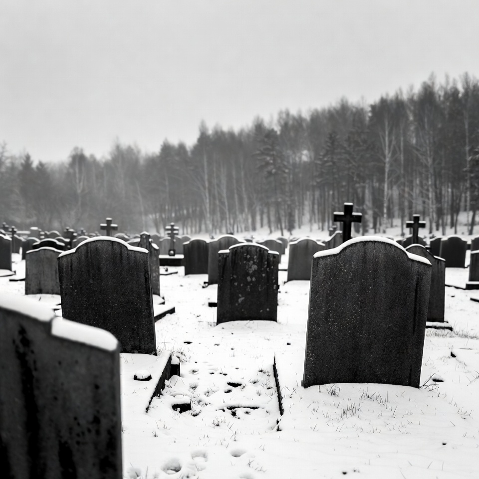 A black and white photograph shows numerous gravestones covered in snow within a cemetery. Crosses and tombstones are scattered across the snowy ground, with bare trees lining the background under a cloudy sky. The scene captures a serene winter burial ground.