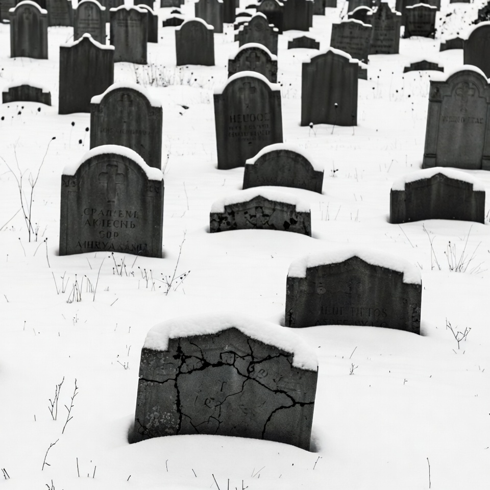 A vast cemetery filled with numerous dark gravestones covered in snow. The tombstones vary in shape and size, some cracked and weathered, standing amid a snowy field. Sparse dry grass pokes through the snow around the graves.