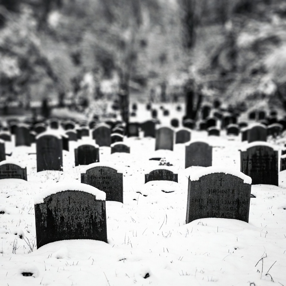 A black and white photograph shows numerous gravestones covered in snow within a foggy cemetery. Bare trees and a blurred background create a sense of depth. Some stones feature visible inscriptions and a cross emblem.