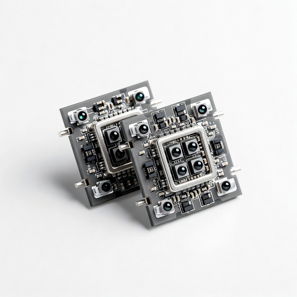 Two identical square circuit boards with multiple small cameras arranged in a grid pattern are placed side by side on a white background. Each board features a central silver frame enclosing four blue-lensed cameras and various electronic components. The boards have black and metallic surfaces with exposed wiring and connectors.