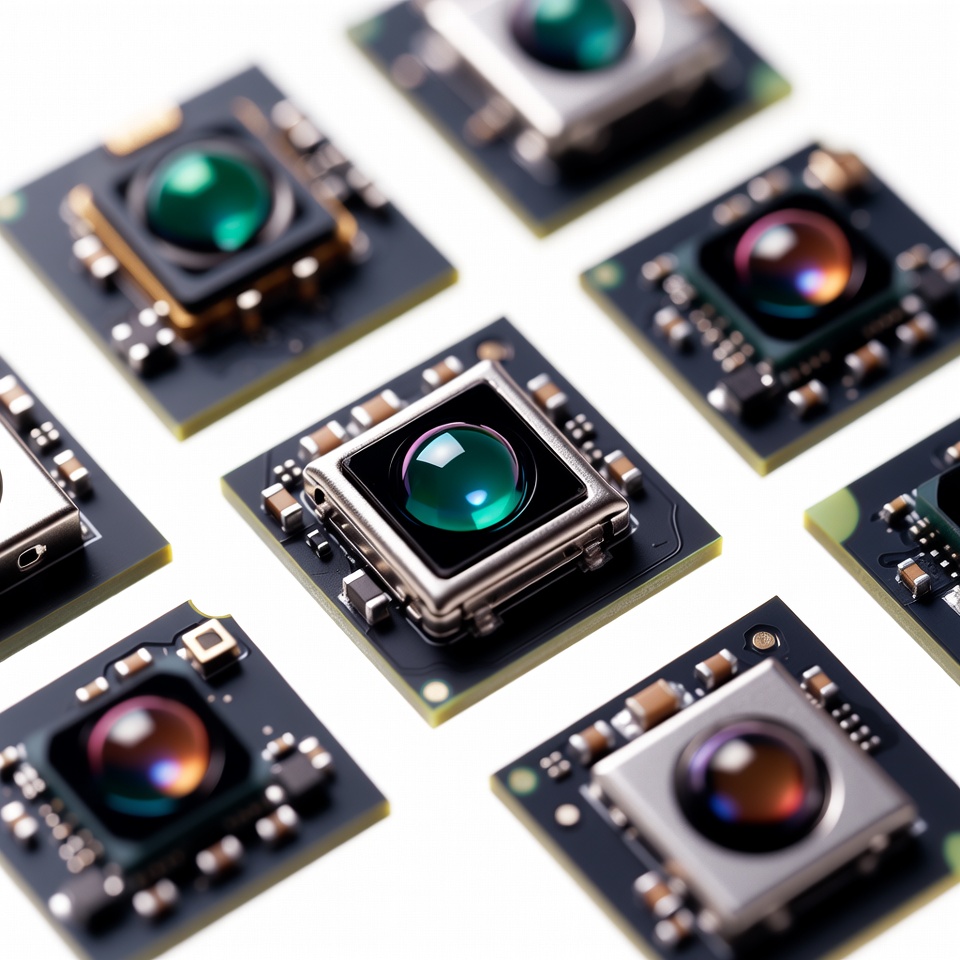 PCB module, camera lens, circuit board, electronic component, embedded camera, green lens, isolated background, macro photography, multicolor lens, multiple cameras, product photography, small cameras, smartphone camera, tech hardware, camera module