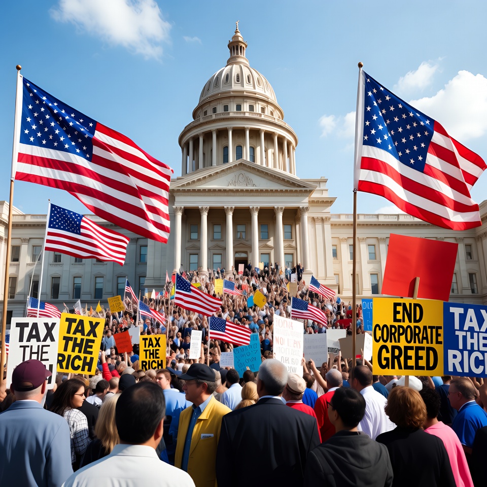 American flags, activism, activists, building, capitol building, cloudy sky, corporate greed, crowd, demonstration, diverse crowd, dome, flags, men, outdoor, patriotism, politics, rally, signs, sunny, tax the rich, wealth inequality, women, protest