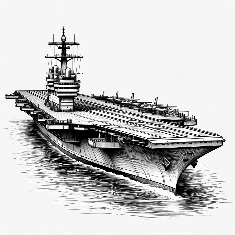 A detailed black and white ink drawing of a large aircraft carrier sailing on the ocean. The ship features multiple decks, a prominent island superstructure, and several fighter jets parked on the flight deck. Waves surround the vessel in the foreground.