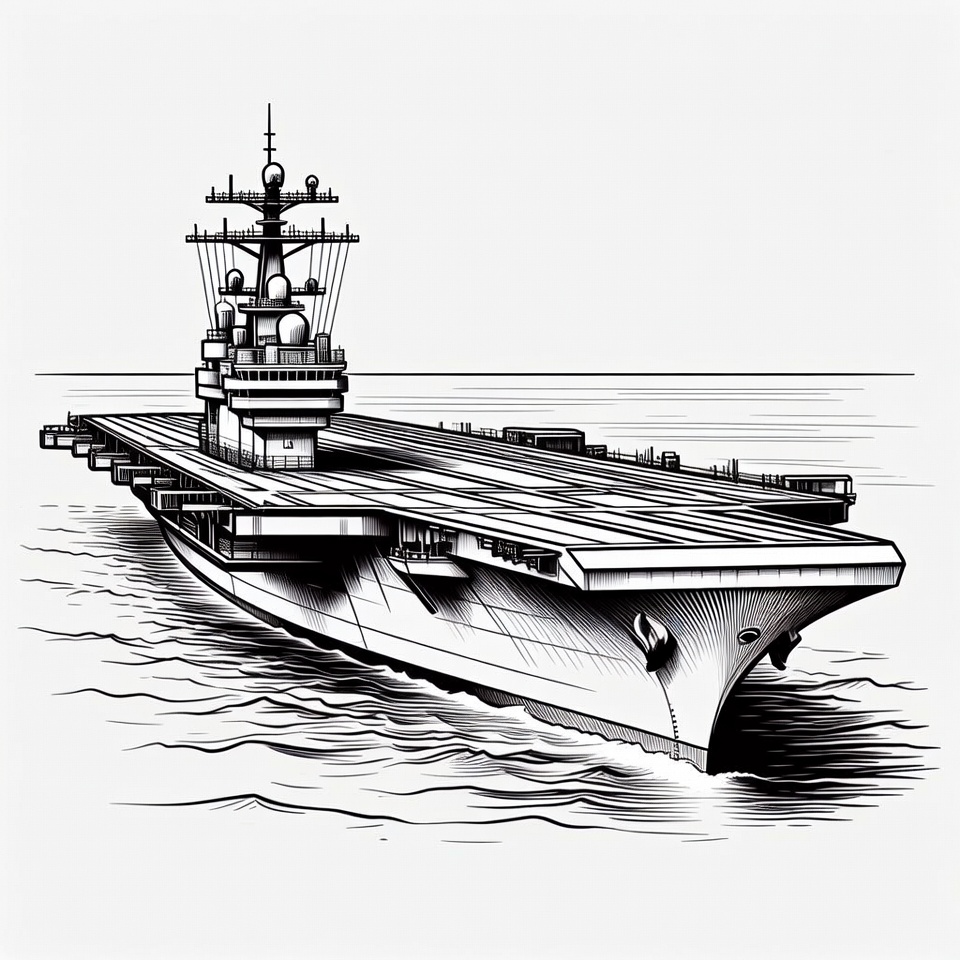 A detailed black and white line art illustration depicts a large aircraft carrier sailing on the ocean. The ship features a wide flight deck, multiple radar masts, and docked at a pier with calm waters surrounding it. Intricate ink line drawings highlight the naval vessel's structure and details.