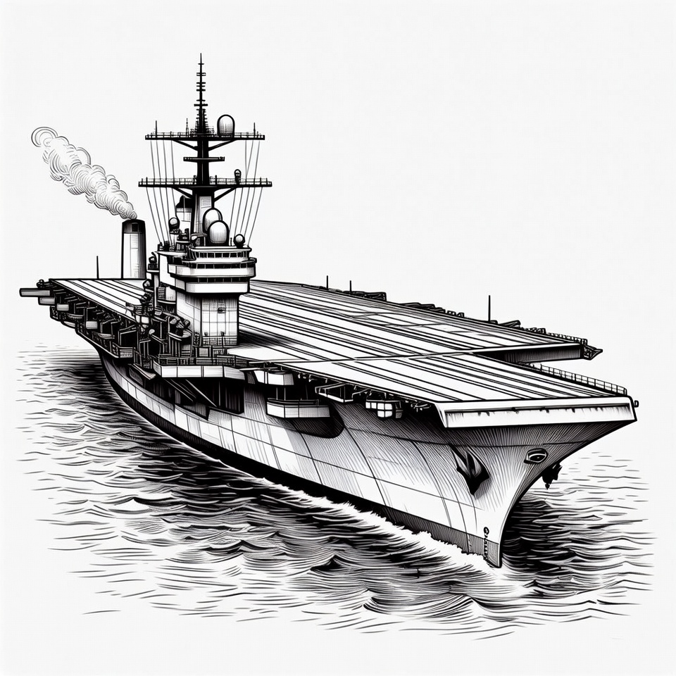 black and white, clipart, flight deck, illustration, ink drawing, island superstructure, isolated background, line art, military vessel, navy ship, ocean waves, radar antennas, sailing ship, sea, smokestack, vector art, warship, aircraft carrier