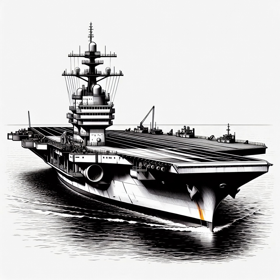 A detailed black and white illustration of a large aircraft carrier sailing on the ocean. The ship features a wide flight deck, multiple radar masts, cranes, and other naval equipment. Waves ripple around the hull in the water.