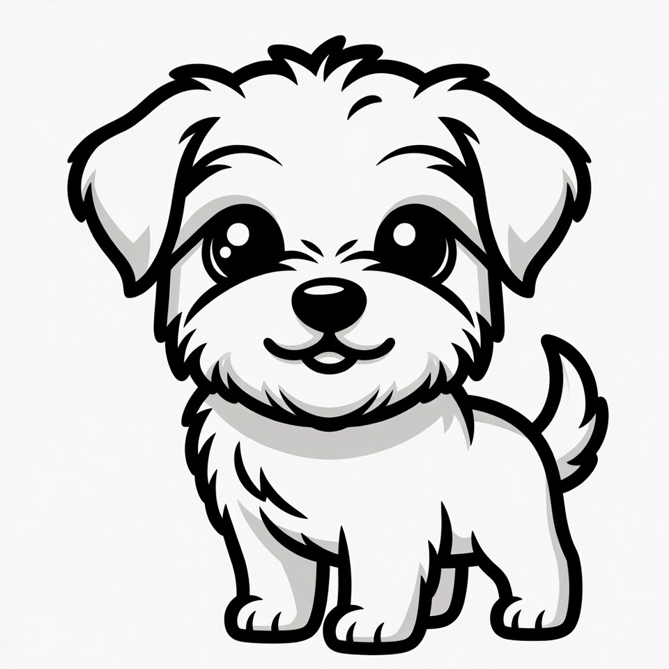 adorable dog, animal, big eyes, black and white, cartoon dog, chibi style, clipart, cute puppy, dog, fluffy dog, illustration, isolated background, line art, pet, puppy, smiling dog, standing puppy, vector art, Shih Tzu