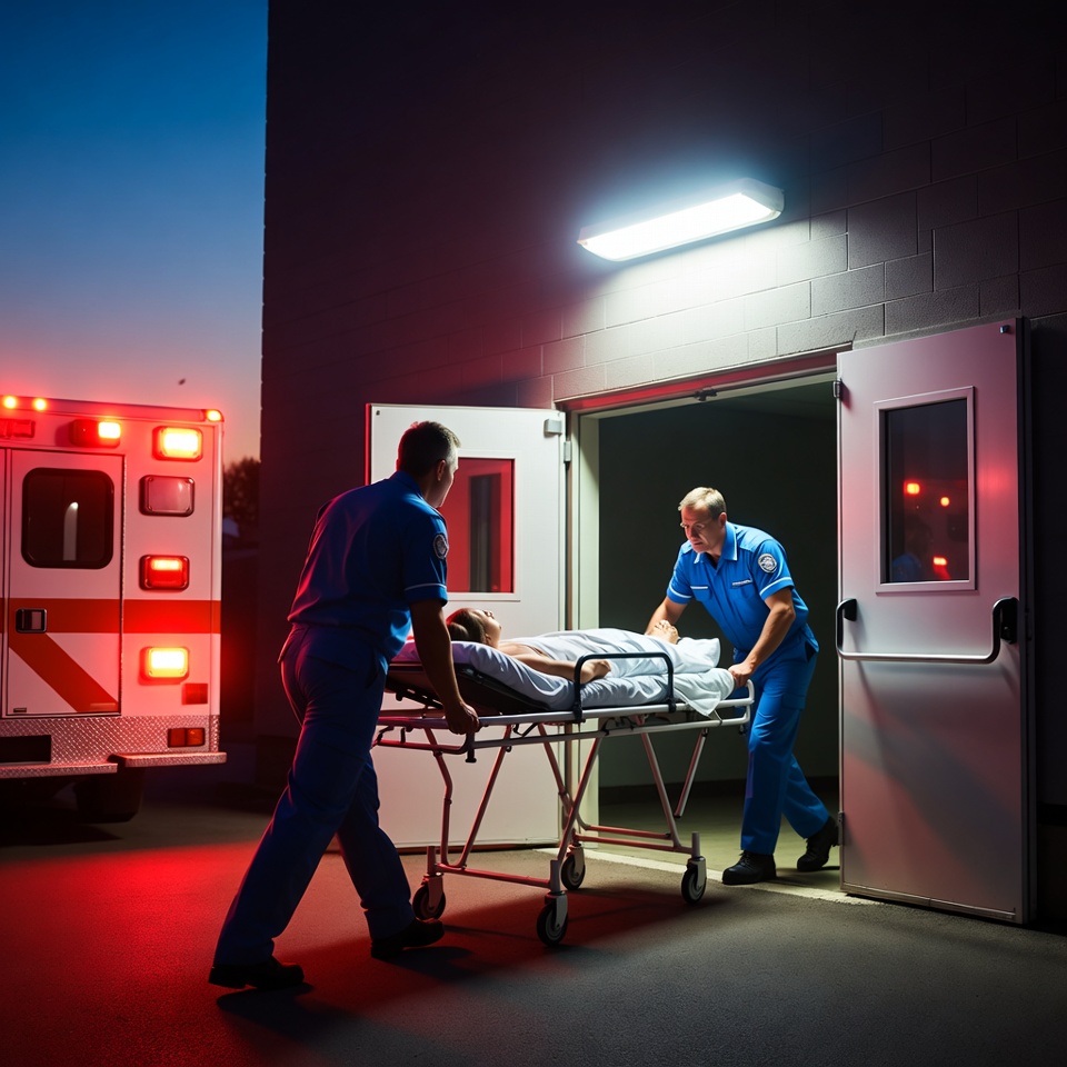 Two male paramedics in blue uniforms push a stretcher with a patient towards an open hospital door at night. A red ambulance with flashing lights is parked nearby, and bright overhead lights illuminate the scene. The patient lies covered on the stretcher outside the emergency entrance.