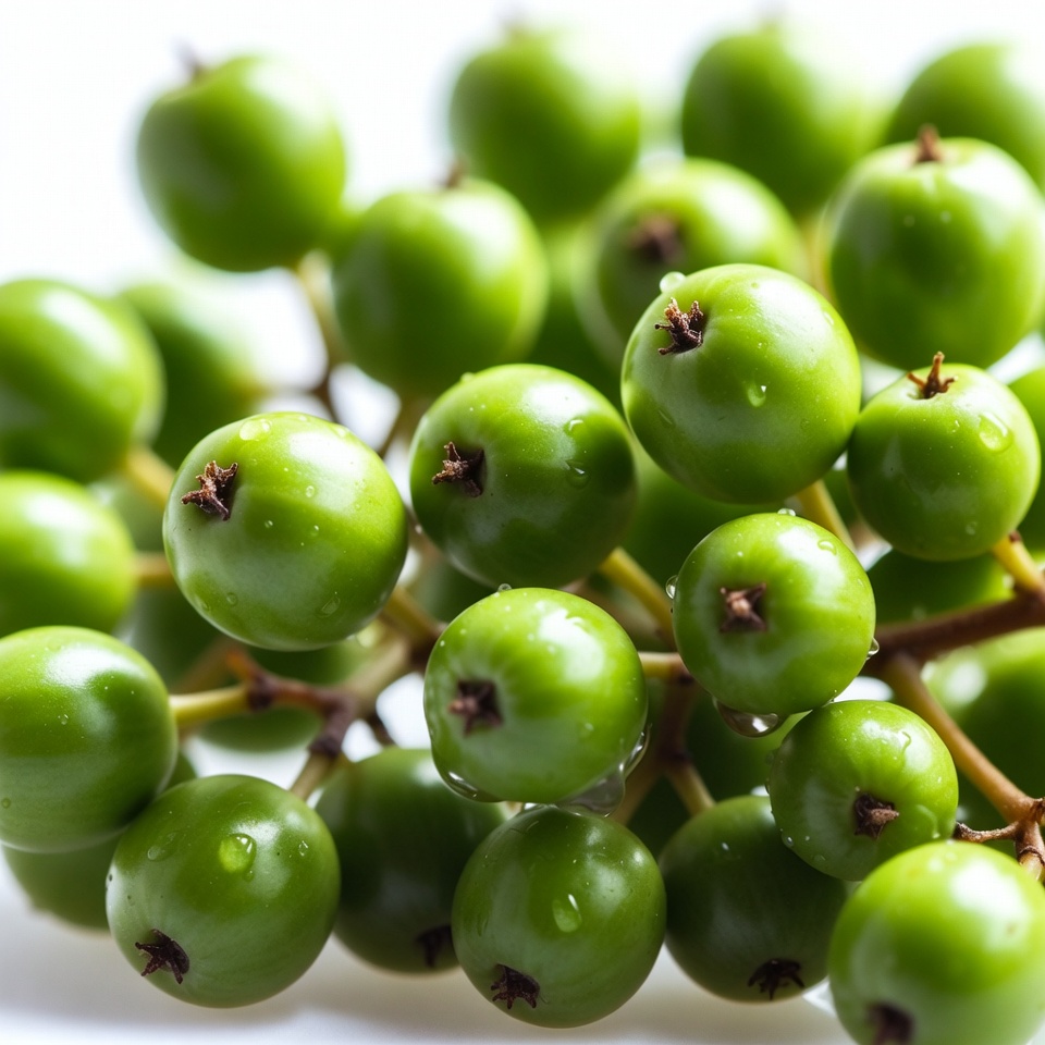 A close-up view shows a dense cluster of small, round green berries on thin stems. The berries have a glossy, dewy surface with tiny dark stems attached. They are arranged against a plain white background.
