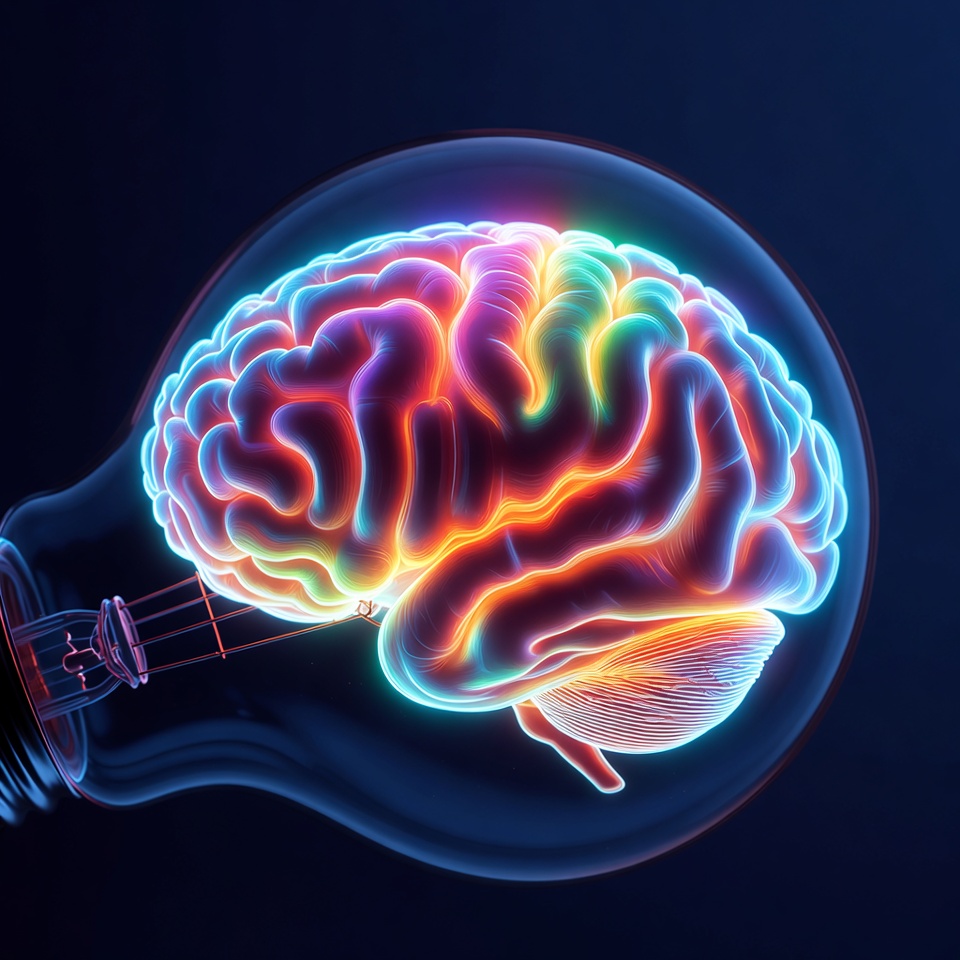 A vibrant, neon-colored human brain fills the inside of a clear glass light bulb. The brain glows with multicolored lights in pink, blue, green, and purple hues against a dark background. The design symbolizes creativity and intelligence.