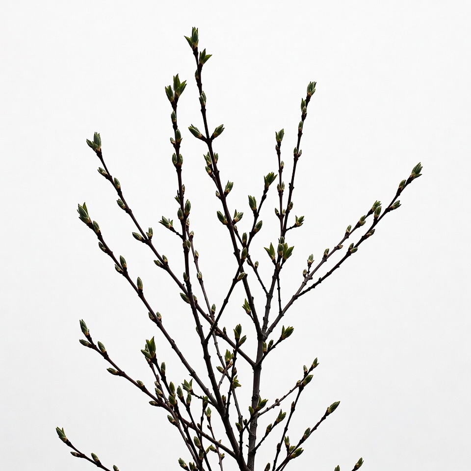 A close-up of slender tree branches with numerous small green buds sprouting from dark twigs. The branches extend upward against a plain white background. The image highlights the delicate new growth in spring.