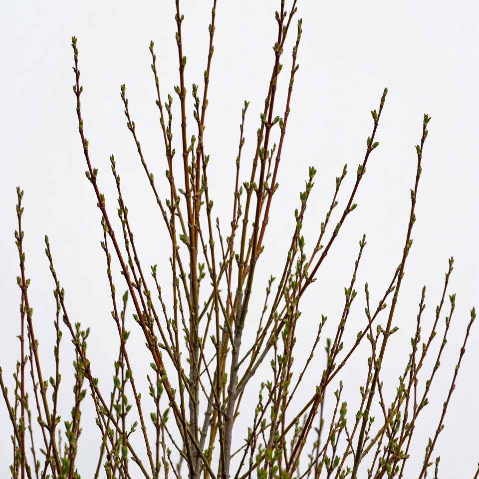 Close-up of slender tree branches with fresh green buds and reddish stems against a plain white background. The buds are emerging vibrantly from the tips of the twigs. The image is isolated for clear focus on the new spring growth.