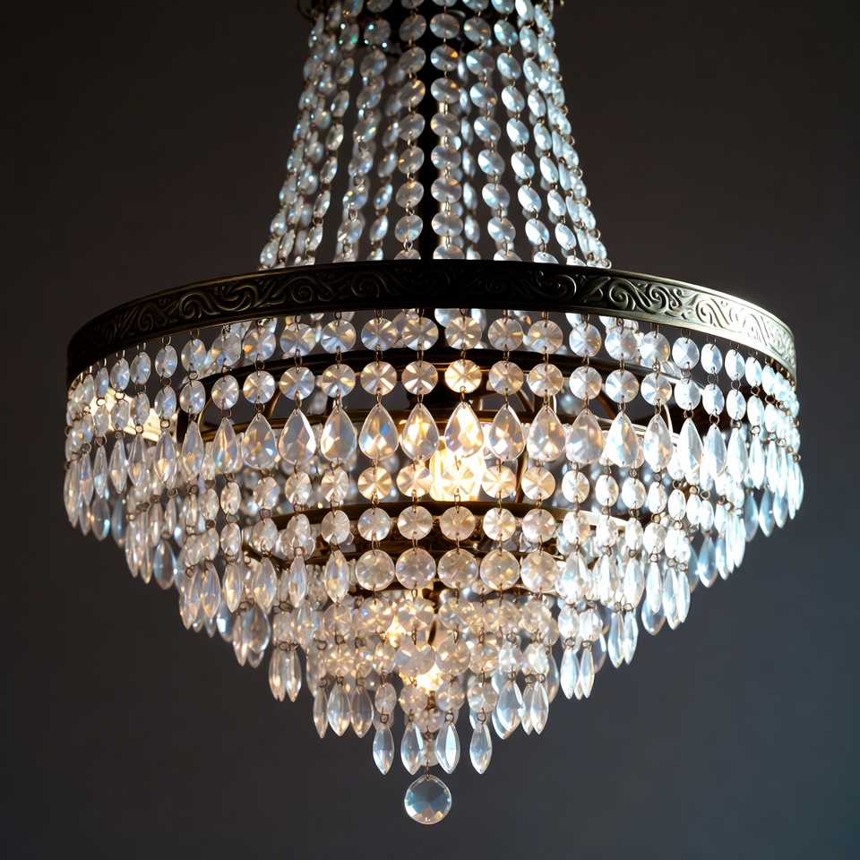 beads, ceiling light, crystal beads, crystal chandelier, crystals, dark background, decorative chandelier, dining room light, droplets, elegant lighting, faceted crystals, glass beads, hanging light, home lighting, illuminated chandelier, interior decor, light fixture, lighting, luxury decor, luxury lighting, metal rim, ornate frame, sparkle, tiered design, vintage chandelier, warm glow, chandelier