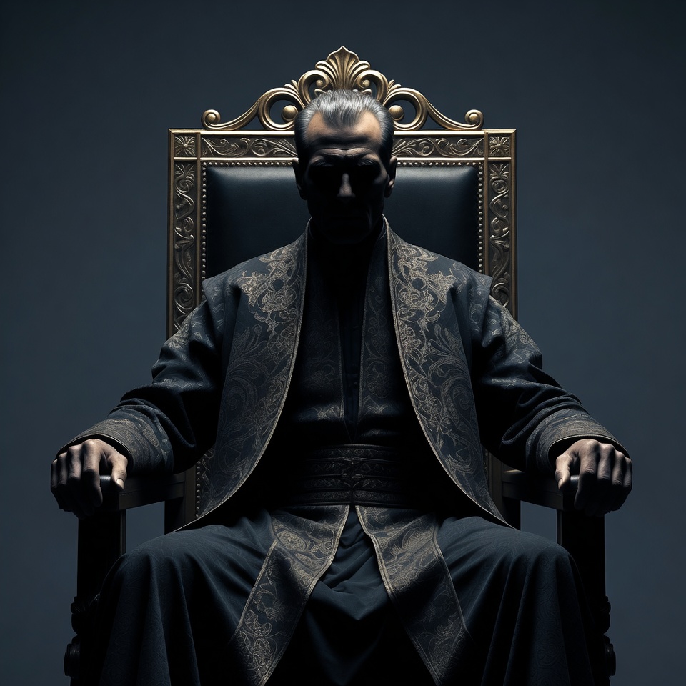 An older man with gray hair sits on a grand golden throne with intricate carvings and black leather seat. He wears a dark embroidered robe with wide sleeves and a sash, hands resting on the armrests. The image features dramatic lighting and a dark background.