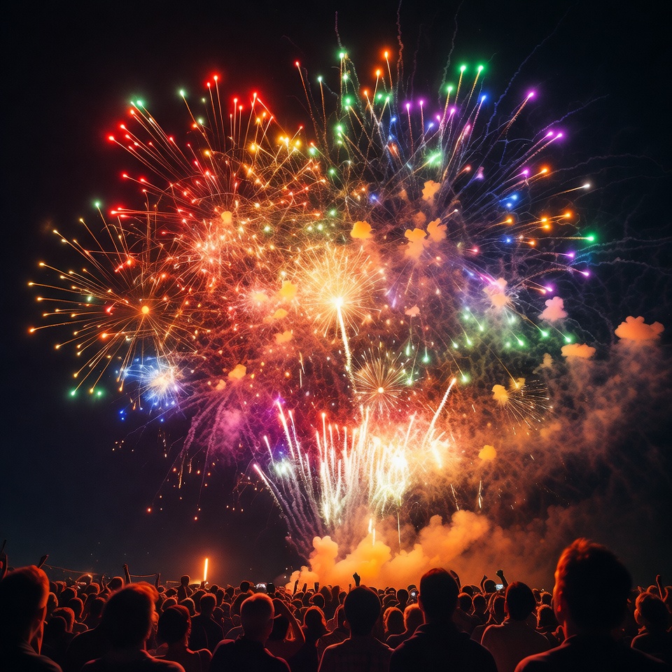 blue fireworks, celebration, colorful fireworks, crowd, dark background, explosion, festival, fireworks display, green fireworks, holiday, independence day, new year, night, night sky, people watching, pyrotechnics, red fireworks, silhouetted crowd, smoke, vibrant colors, yellow fireworks, fireworks