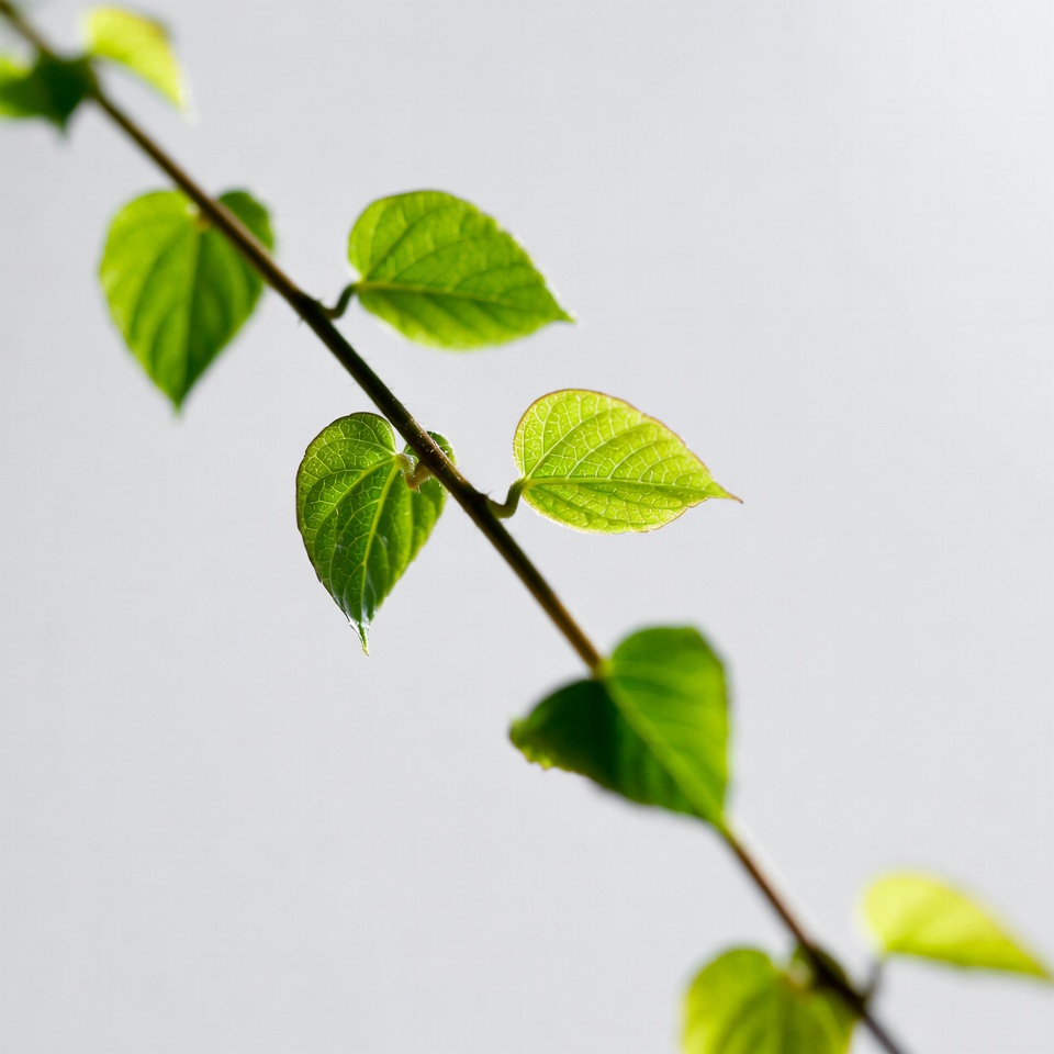 A close-up view shows a slender vine stem with multiple bright green leaves arranged along its length. The leaves have serrated edges and prominent veins, displaying a fresh and vibrant appearance. The background is a plain light gray, isolating the plant elements.