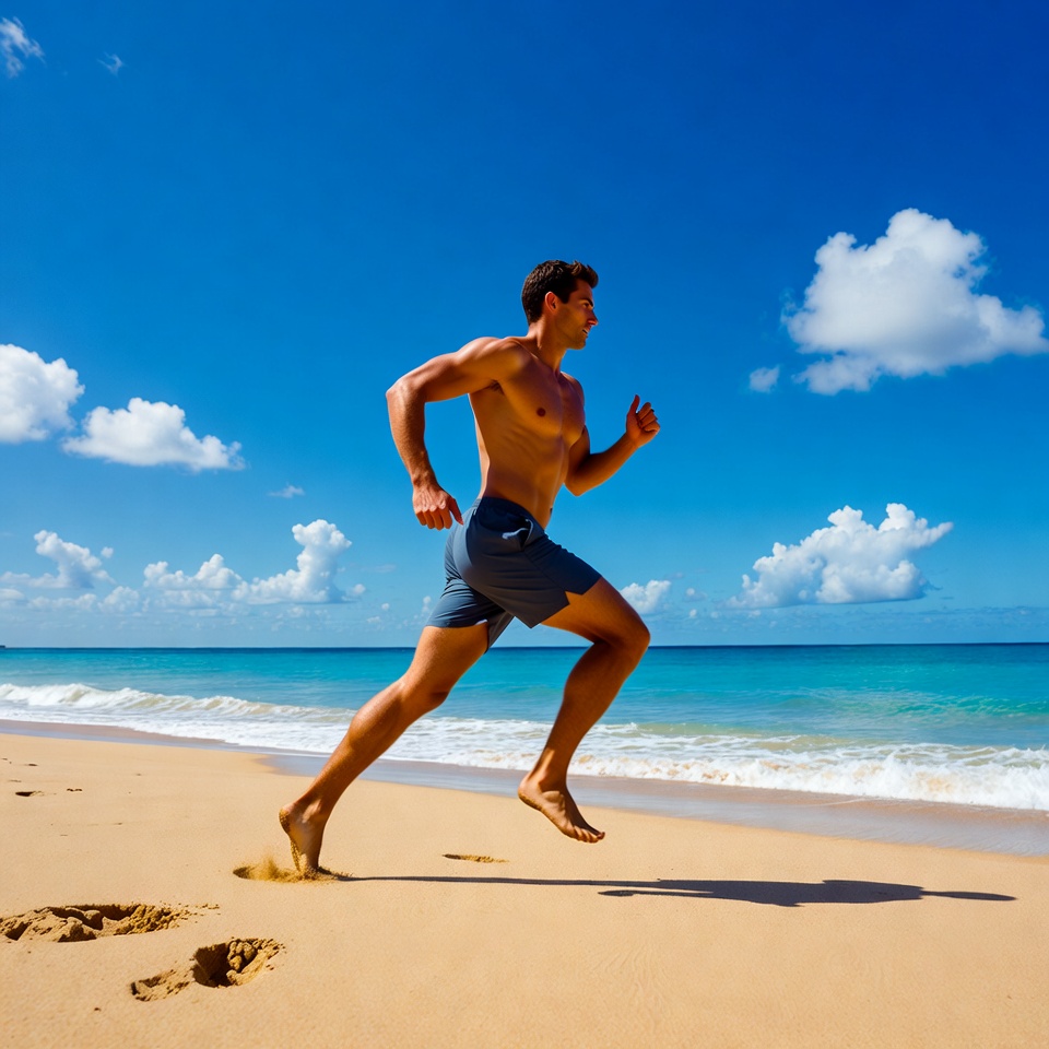A muscular White man with dark hair runs barefoot on a sandy beach. He wears blue swim trunks and is shirtless, with ocean waves and a clear blue sky in the background. His footprints trail behind him in the sand.