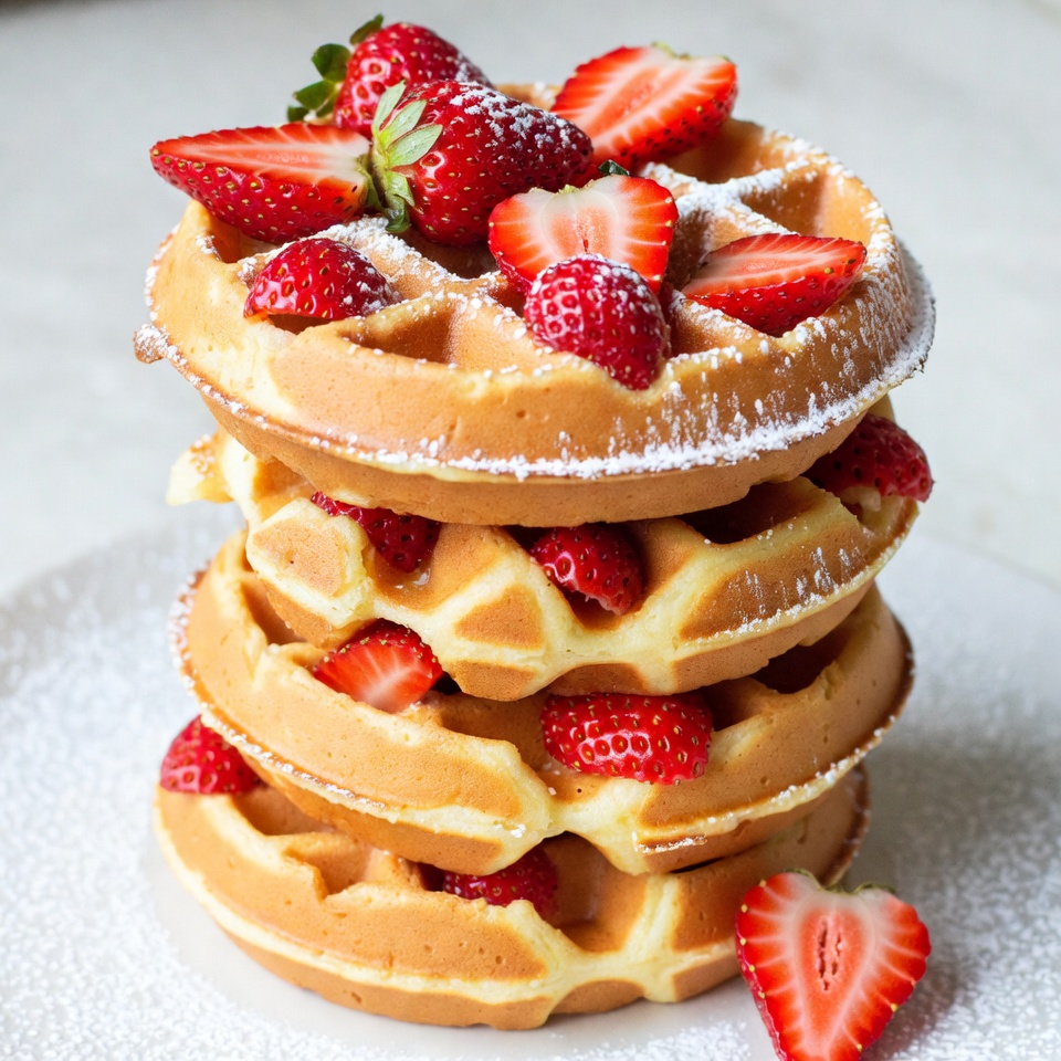 A tall stack of golden waffles sits on a white plate, topped with fresh red strawberries and powdered sugar. The strawberries are sliced and whole, scattered generously over the waffles. The dish is presented on a white surface with a light dusting of sugar around the base.