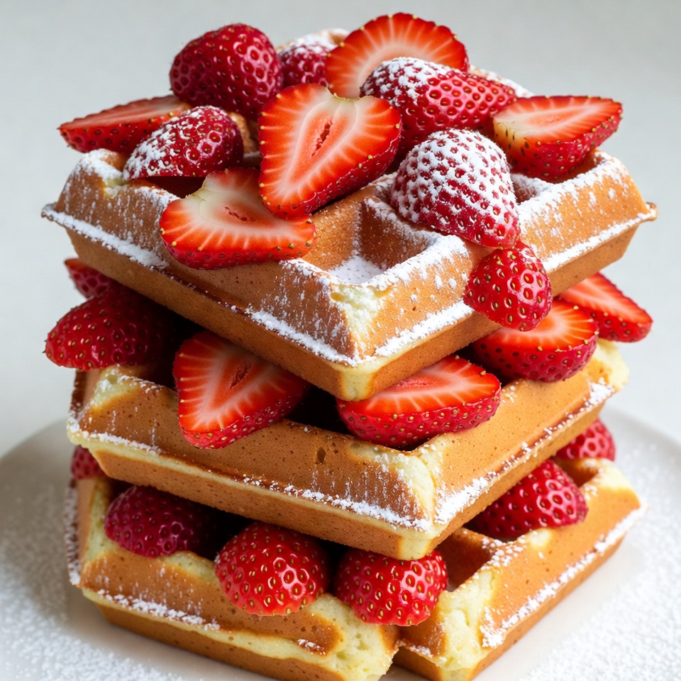 A stack of golden waffles is topped with fresh sliced strawberries and dusted generously with powdered sugar. The waffles sit on a white plate against a plain white background. Vibrant red strawberries contrast with the light powdered sugar coating.