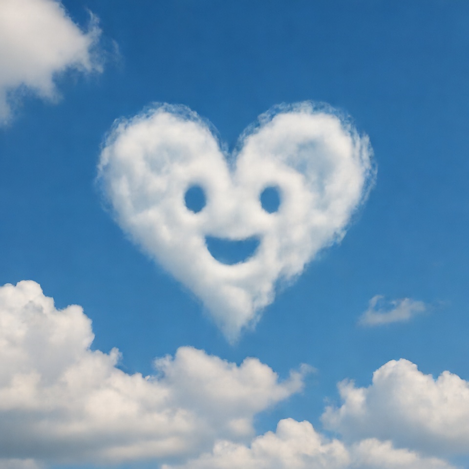 A large white cloud shaped like a smiling heart floats in a bright blue sky. The heart cloud features two round eyes and a wide curved mouth. Surrounding smaller clouds dot the vibrant sky.