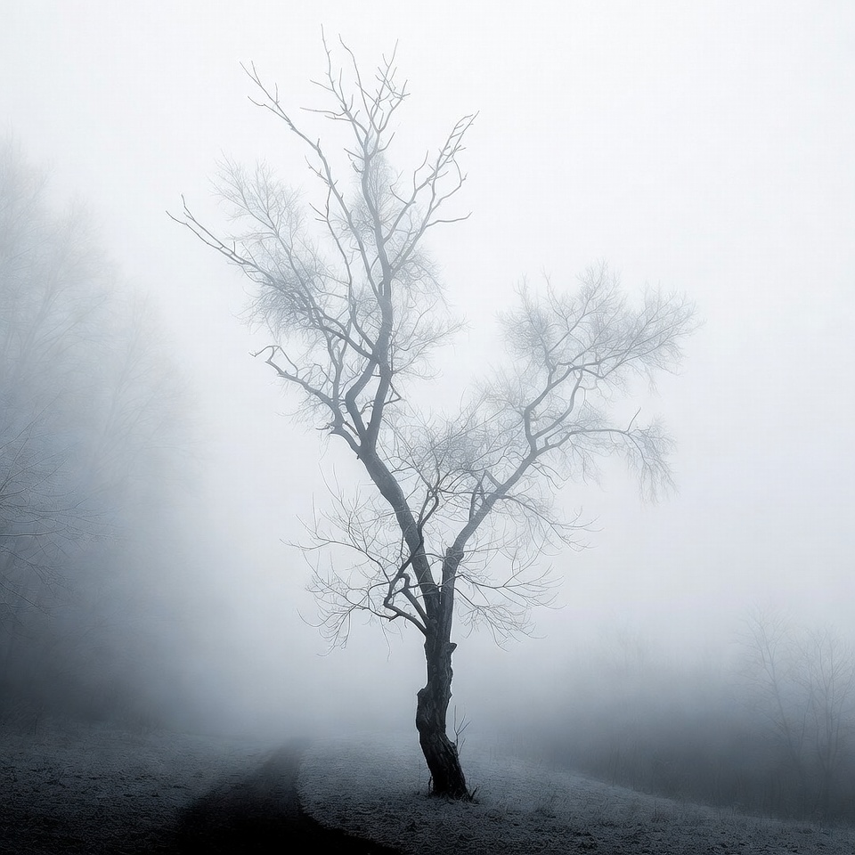 A barren tree with twisted branches stands alone on a misty hillside. Dense fog envelops the scene, obscuring distant trees and creating a soft, ethereal atmosphere. The ground appears slightly elevated with subtle contours visible through the haze.