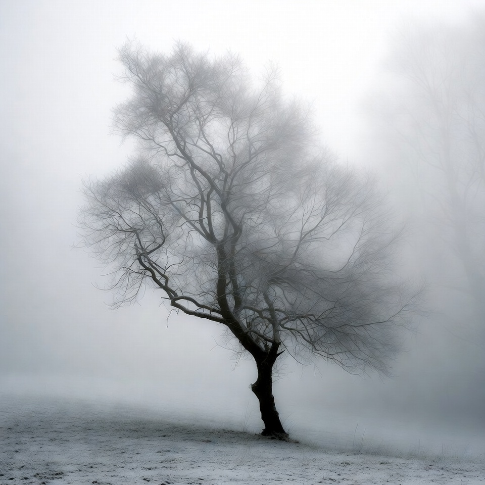 Lonely Tree in Snowy Fog