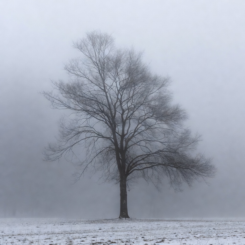 A single barren tree stands silhouetted against a foggy background on a snowy field. Its twisted branches reach into the misty gray sky. The ground is lightly covered in snow with no other elements visible.