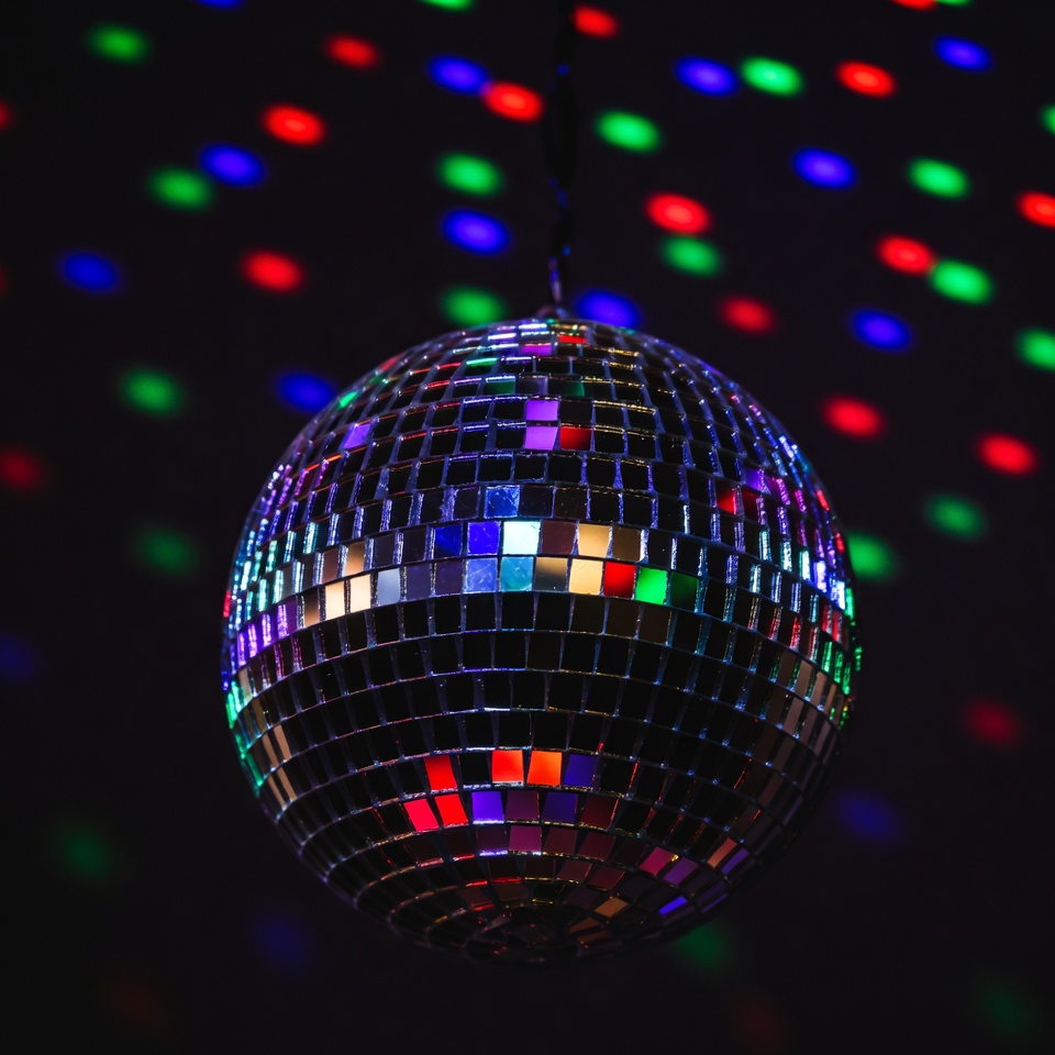 blue lights, club lighting, colorful lights, dance floor, dark background, disco light, disco party, green lights, hanging ball, hanging chain, mirror ball, mirror tiles, nightclub, party decoration, red lights, reflective surface, shiny ball, sparkling lights, vibrant colors, disco ball