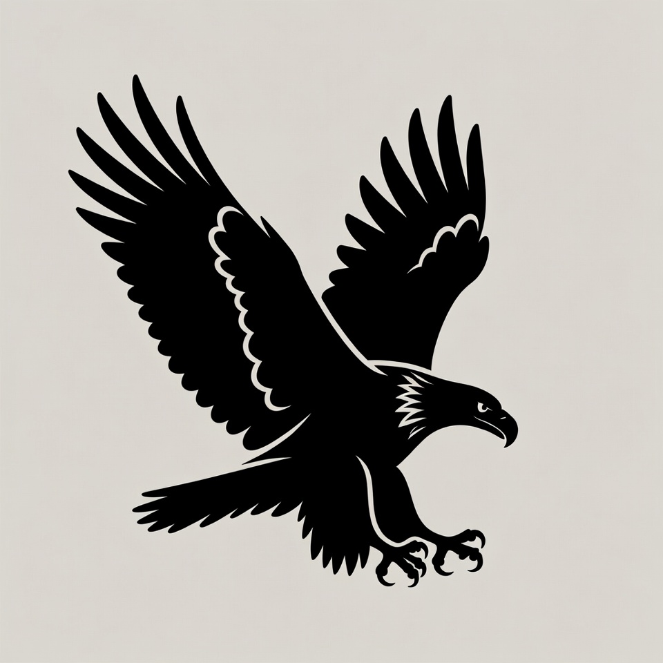 A black silhouette illustration of a bald eagle with wings spread wide in flight. The detailed outline shows sharp talons, feathers, and a fierce beak. It is isolated on a plain gray background.
