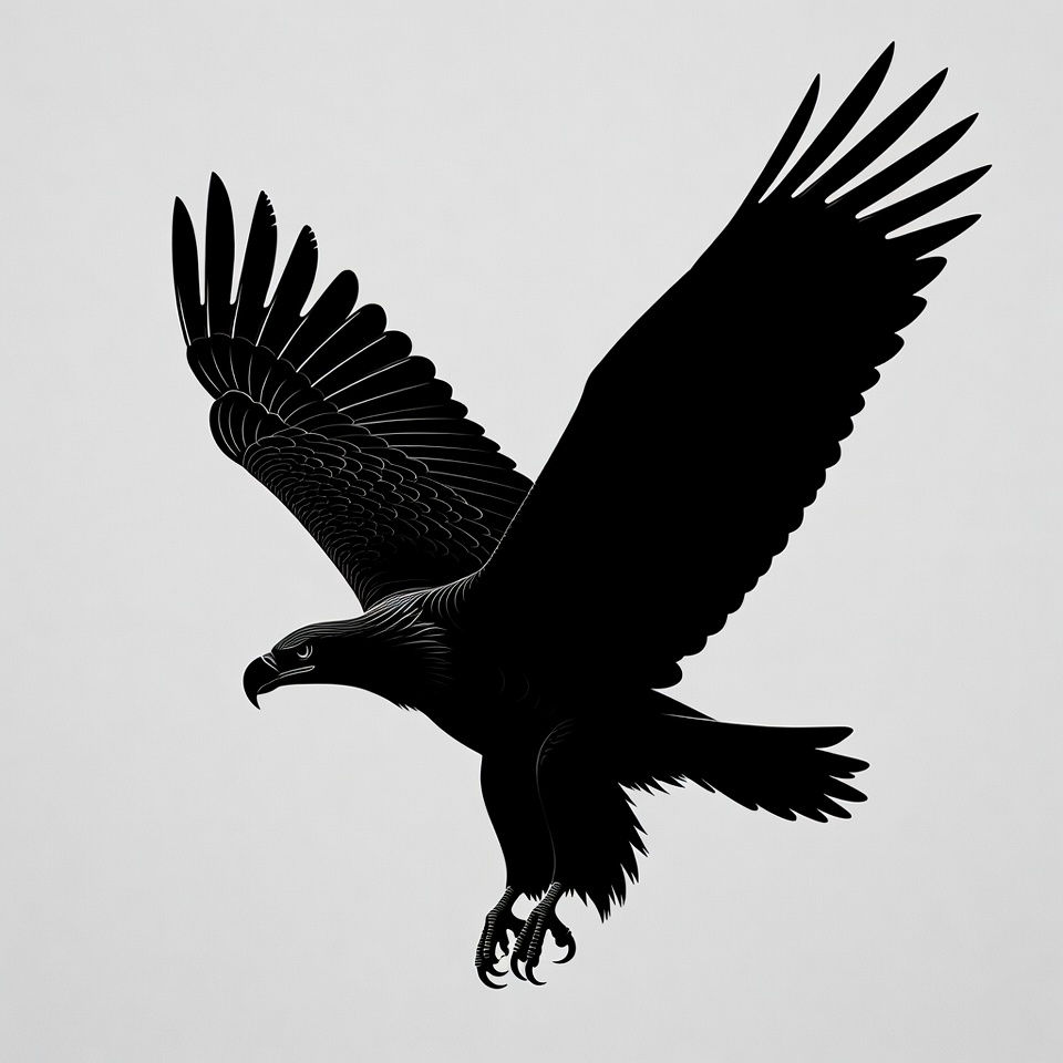 A detailed black silhouette of a bald eagle with wings fully spread in flight. The eagle features sharp talons, a prominent beak, and intricate feather patterns on a plain white background. It is depicted in a dynamic soaring pose.