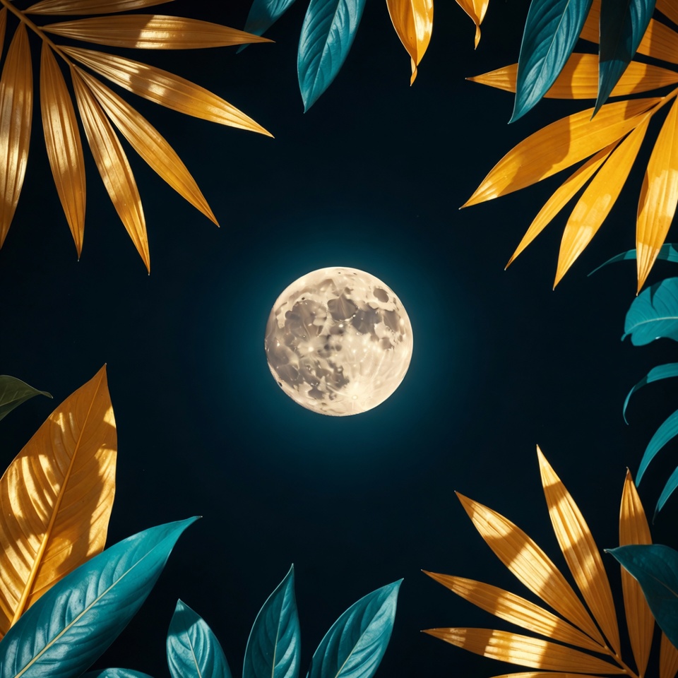 A glowing full moon is centered against a dark background, framed by vibrant tropical leaves in shades of teal and gold. The leaves feature glossy, metallic highlights and fan out symmetrically around the moon. The composition creates a striking contrast between the luminous moon and the colorful foliage.