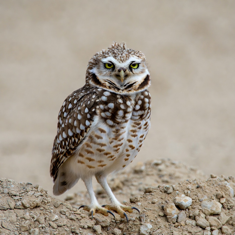 animal, bird, brown owl, desert owl, dirt mound, feathers, isolated background, nature, owl, raptor, sand background, small owl, spotted feathers, talons, white eyebrows, wildlife, yellow eyes, burrowing owl