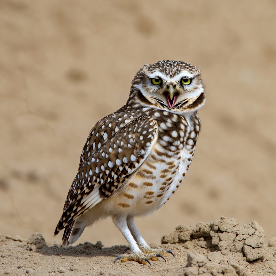 A burrowing owl with spotted brown and white feathers stands on sandy terrain. It faces forward with large yellow eyes and an open beak. The background features a blurred desert-like sandy area.