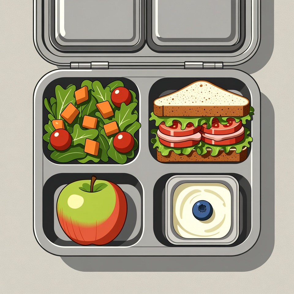 bento box, blueberries, bread, cherry tomatoes, clipart, dairy, diced carrots, food compartments, fresh food, fruit, green apple, healthy lunch, illustration, isolated background, lettuce, meal prep, open lunchbox, salad, sandwich, tomato sandwich, vegetables, yogurt, lunchbox
