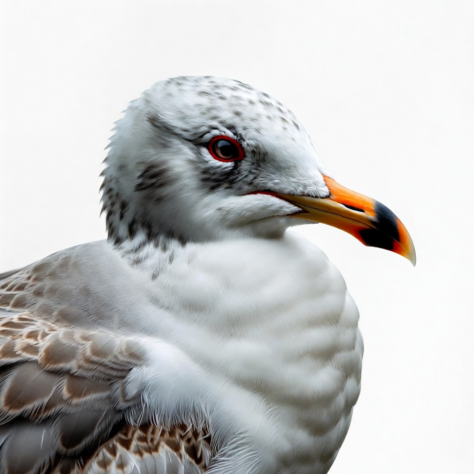 A seagull with white and gray feathers faces the camera against a plain white background. It has a striking orange beak with black tip and red eyes. The bird's head is turned slightly, showing detailed plumage on its neck.