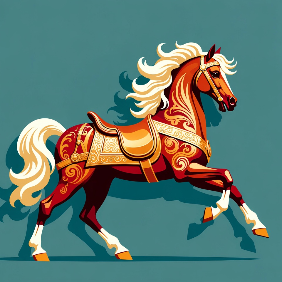 A vibrant vector illustration of a chestnut horse with flowing white mane and tail gallops dynamically. It wears an intricately decorated saddle with gold and red patterns on a teal background. The horse's legs are extended mid-stride, casting a shadow beneath.