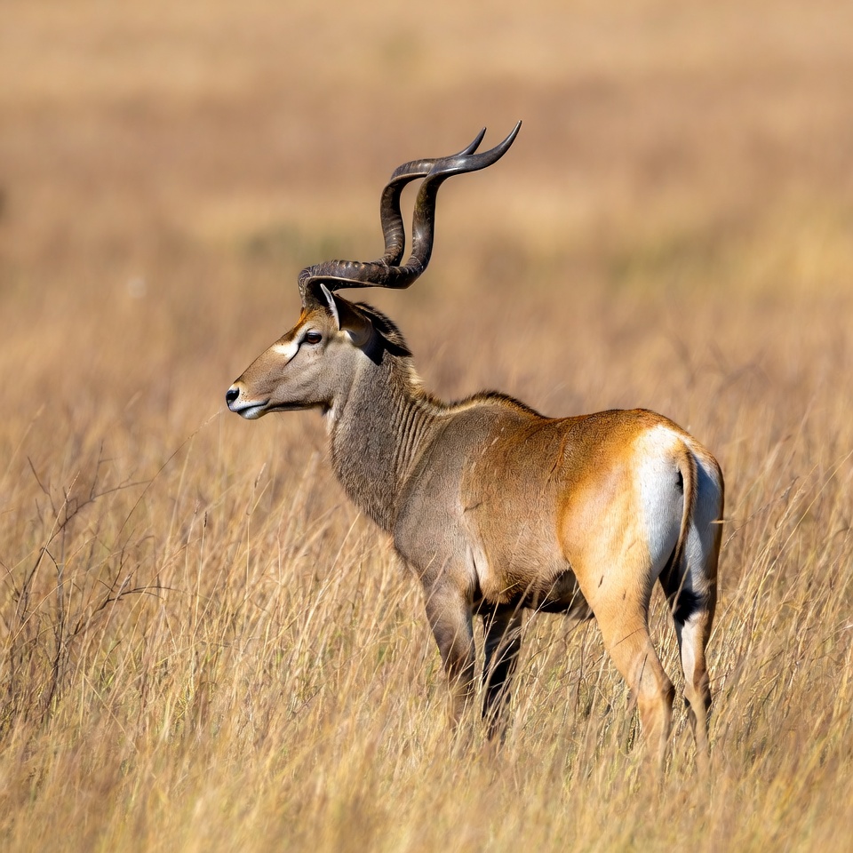 Africa, African wildlife, animal, antelope, brown coat, curved horns, dry grass, golden grass, grassland, horns, mammal, nature, outdoors, profile view, safari, savanna, standing, wild animal, wildlife, eland