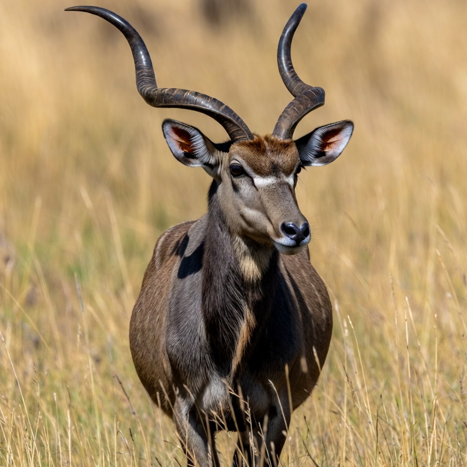 A kudu antelope with large curved horns stands in tall golden grass. Its reddish-brown coat and white facial markings are visible against the blurred savanna background. The animal faces forward with ears perked.