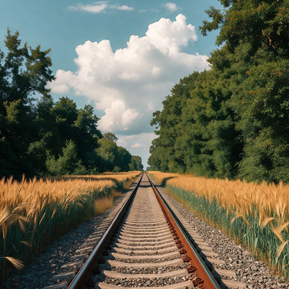 Railroad tracks extend into the distance, flanked by tall golden wheat fields on both sides. Lush green trees line the horizon under a bright blue sky with large white clouds. The scene captures a serene rural landscape with vibrant natural colors.