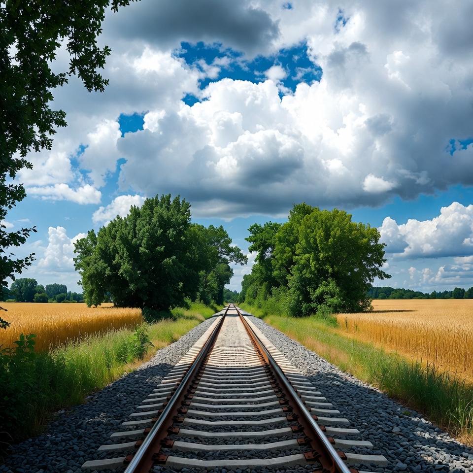 agriculture, blue sky, clouds, countryside, field, golden wheat, grass, grassy path, gray clouds, green trees, nature, outdoors, path, railway, rural landscape, sky, summer scenery, train tracks, trees, wheat field, white clouds, railroad tracks