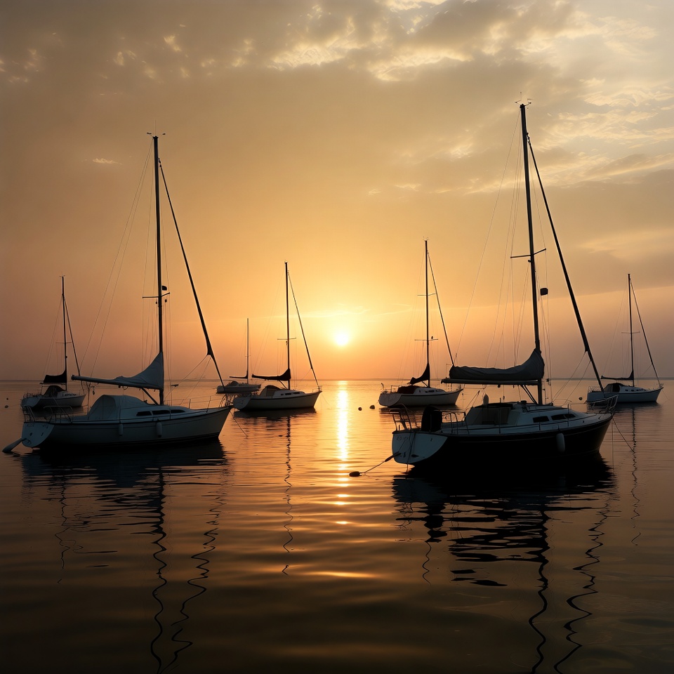 boats, calm water, clouds, dusk, evening, golden hour, harbor, horizon, marina, masts, nautical, orange sky, peaceful, reflections, sailboat fleet, scenic, sea, serene landscape, silhouette, sun reflection, sunset, twilight, water, yacht, sailboats