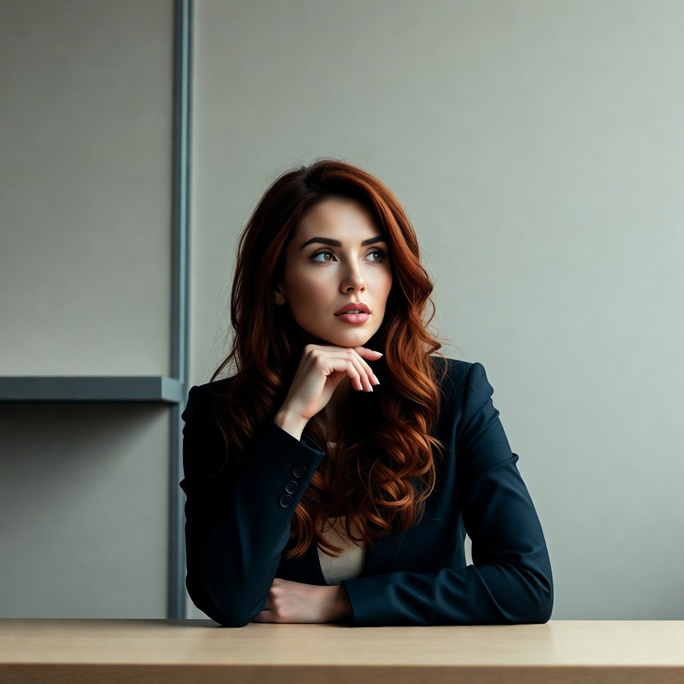 A woman with long red hair sits at a wooden desk, resting her chin on her hand in a thoughtful pose. She wears a dark navy blazer and white blouse, gazing to the side with a neutral expression. The background features light gray walls and shelves.