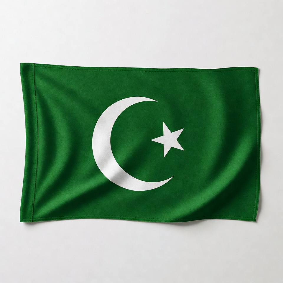 A vibrant green flag of Pakistan waves gently against a white background. It features a white crescent moon and five-pointed star in the center. The flag has a realistic fabric texture with subtle folds.
