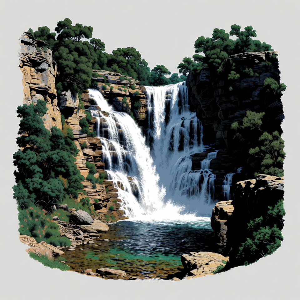 A majestic multi-tiered waterfall cascades down rugged rocky cliffs surrounded by lush green trees. Clear water pools at the base amid mossy rocks and dense foliage. The scene features vibrant greens and blues on an isolated background.
