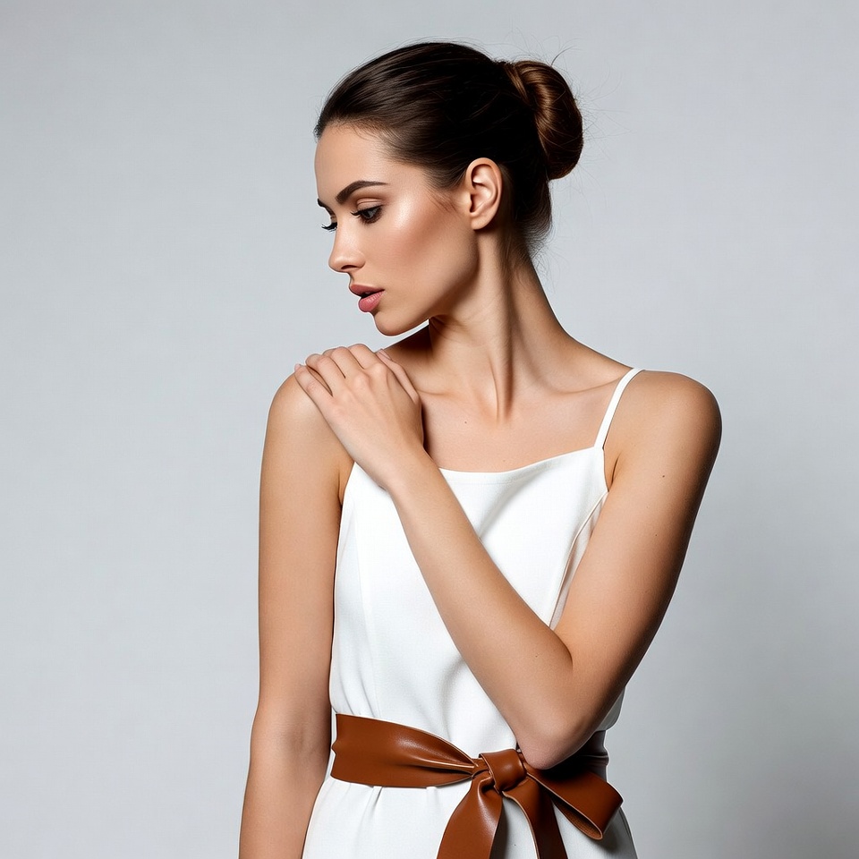 A woman with dark brown hair in a bun poses in profile against a gray background. She wears a white spaghetti-strap dress with a wide brown leather belt around her waist. Her hand rests on her shoulder, highlighting her elegant neckline and subtle makeup.