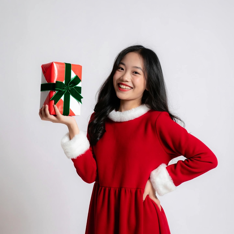 A young Asian woman with long dark hair smiles while holding a large red and green gift box wrapped with a green bow. She wears a festive red Santa dress with white fur trim on the collar and cuffs, standing against a plain white background. Her pose is cheerful with one hand on her hip.