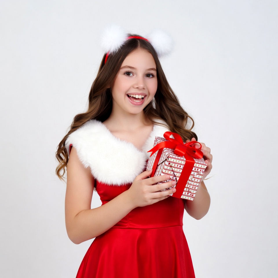Christmas, Christmas present, Santa dress, White, brown hair, bunny ears, cute, festive, gift box, happy, headband, holiday, isolated background, red dress, red gift, smiling, wavy hair, white fur, woman, young girl, girl